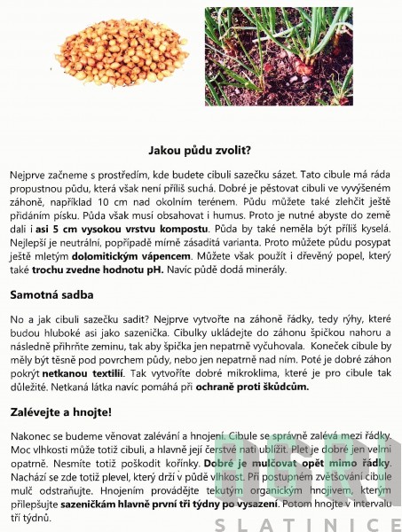 GOLDEN GOURMET - Sazečku je nutné skladovat na suchém chladném místě. Před výsadbou se doporučuje sazečku cibule namořit proti houbovým chorobám. Půda by měla být propustná, dobře zpracovaná s dostatečnou dávkou živin. Cibule však nesnáší přímé hnojení chlévským hnojem. Sázíme do řádků 25 - 30 cm vzdálených, v řádcích na vzdálenost 10 cm a do hloubky cca 3 cm. Cibule šalotka je nazývána též jako česnek askalonský nebo množilka. Vytváří větší množství drobných cibulek v trsu ("hnízdu"). Chuťově je jemnější než klasická cibule, postrádá typickou palčivou cibulovou chuť, je spíše nasládlá a chutná mírně po česneku. Konzumuje se nejen cibulka, ale i šalotková nať, která připomíná svým vzhledem pažitku. Výhodou šalotky je, že narozdíl od klasické cibule nevyvolává plynatost. Šalotka z jarní výsadby dozrává do konzumní zralosti za 80 – 130 dní, podle klimatických podmínek. Po sklizni je třeba nechat rostliny ještě pár dní na záhonu, aby jim zaschla nať, vysoušení na přímém slunci je ideální. Šalotku neskladujte v uzavřených místnostech, potřebuje vzduch. Šalotku od kuchyňské cibule odlišuje jemnější chuť.