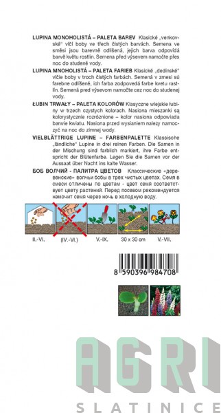 Lupina mnoholistá (Vlčí bob) Lupinus polyphyllus LINDL. / Lupina mnoholistá SMĚS BAREV Klasické „venkovské“ vlčí boby ve třech čistých barvách bílé, červené a modré. Semena ve směsi jsou barevně odlišená, jejich barva odpovídá barvě květu rostlin. Semena před výsevem namočte přes noc do studené vody. Výška 100 cm. Na záhonu spolehlivě vysemeňuje.